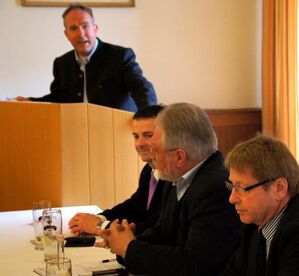 Landtagskandidat Peter Stranninger spricht vor dem Unterbezirksparteitag und forderte, dass „die SPD die Gesellschaft durch Geschlossenheit in die soziale Gerechtigkeit führen" muss. Mit im Bild (v.l.) Landtagskandidat Martin Kreutz, MdL Reinhold Perlak, Bezirkstagskandidat und Unterbezirksvorsitzender Heinz Uekermann.
